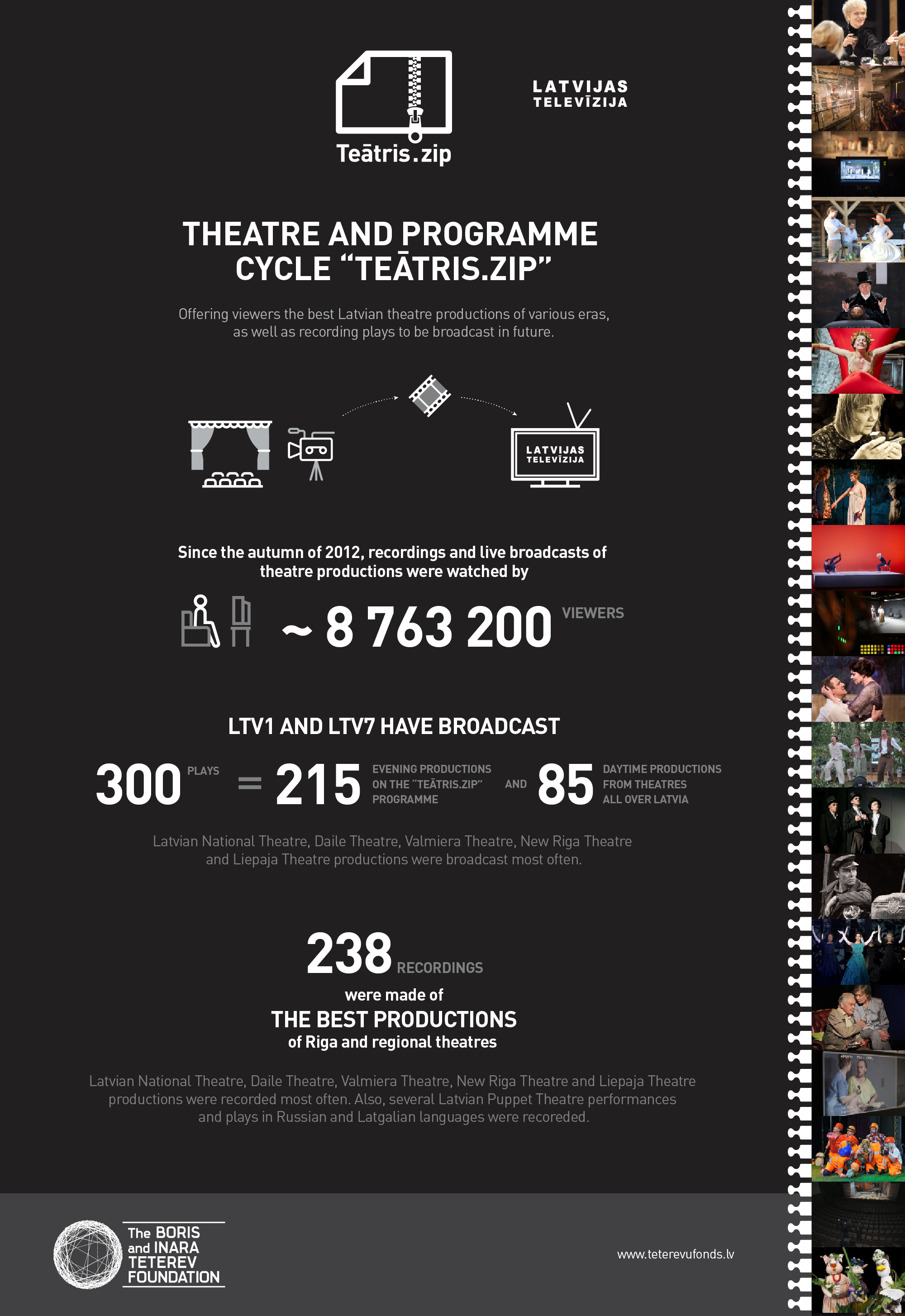 Since autumn 2012, the audience of "Teātris.zip" has had the opportunity to enjoy recordings and live broadcasts of 300 Latvian theatrical productions from various eras.