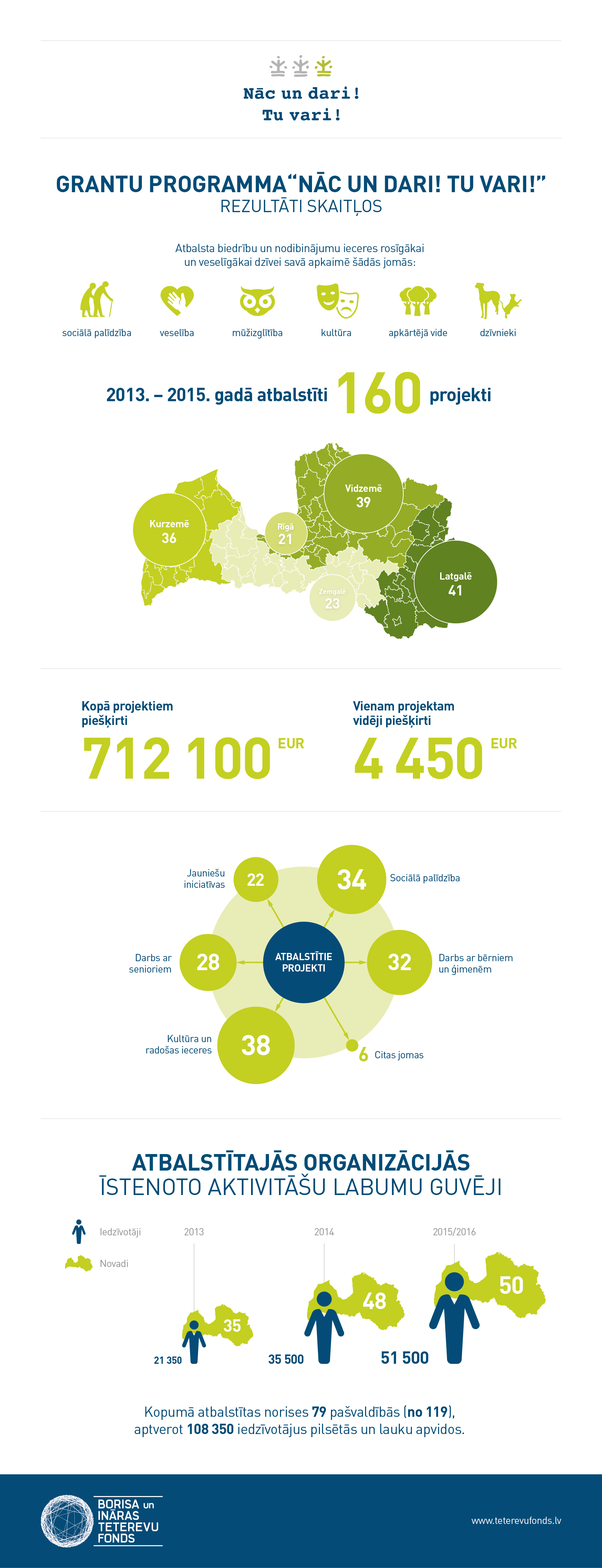 Kopš 2013.gada dažādas ieceres savos novados īstenoja un līdzcilvēkiem palīdzēja 160 organizācijas. Tās saņēma 712 100 eiro lielu Borisa un Ināras Teterevu fonda programmas “Nāc un dari! Tu vari!” atbalstu. Kopumā norises atbalstītas 79 pašvaldībās, aptverot vismaz 108 350 iedzīvotājus pilsētās un laukos.