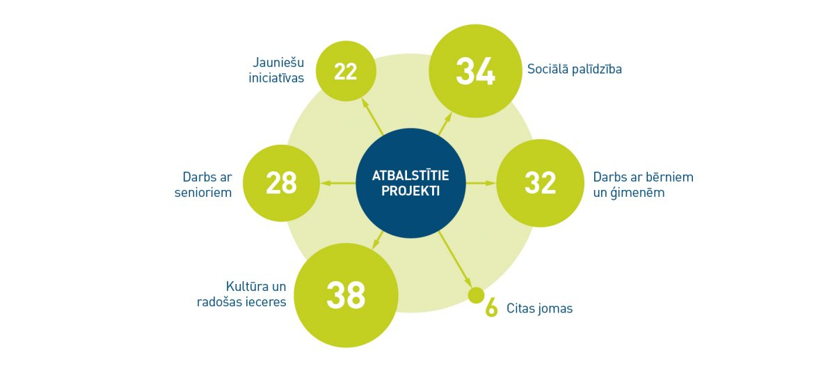 “Organizāciju biedri un brīvprātīgie palīgi īstenoja daudzveidīgas iniciatīvas, paturot savā redzeslokā visaktuālākās intereses un vajadzības: atbalstu ģimenēm, senioriem, personām ar īpašām vajadzībām, jauniešiem, rosinot cilvēkus padarīt savu ikdienu aktīvāku, veselīgāku un saturīgāku,” stāsta labdarības projektu vadītāja Ieva Ernštreite.