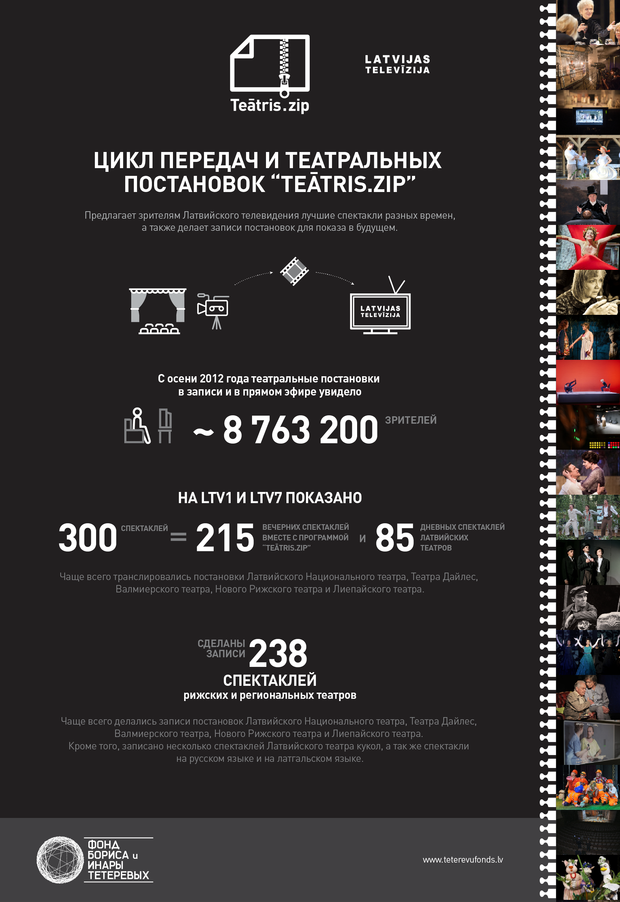 С 2012 года, в течение сезонов проекта "Teātris.zip", у аудитории Латвии была возможность посмотреть 300 спектаклей латвийских театров разных времен в записи или прямом эфире.